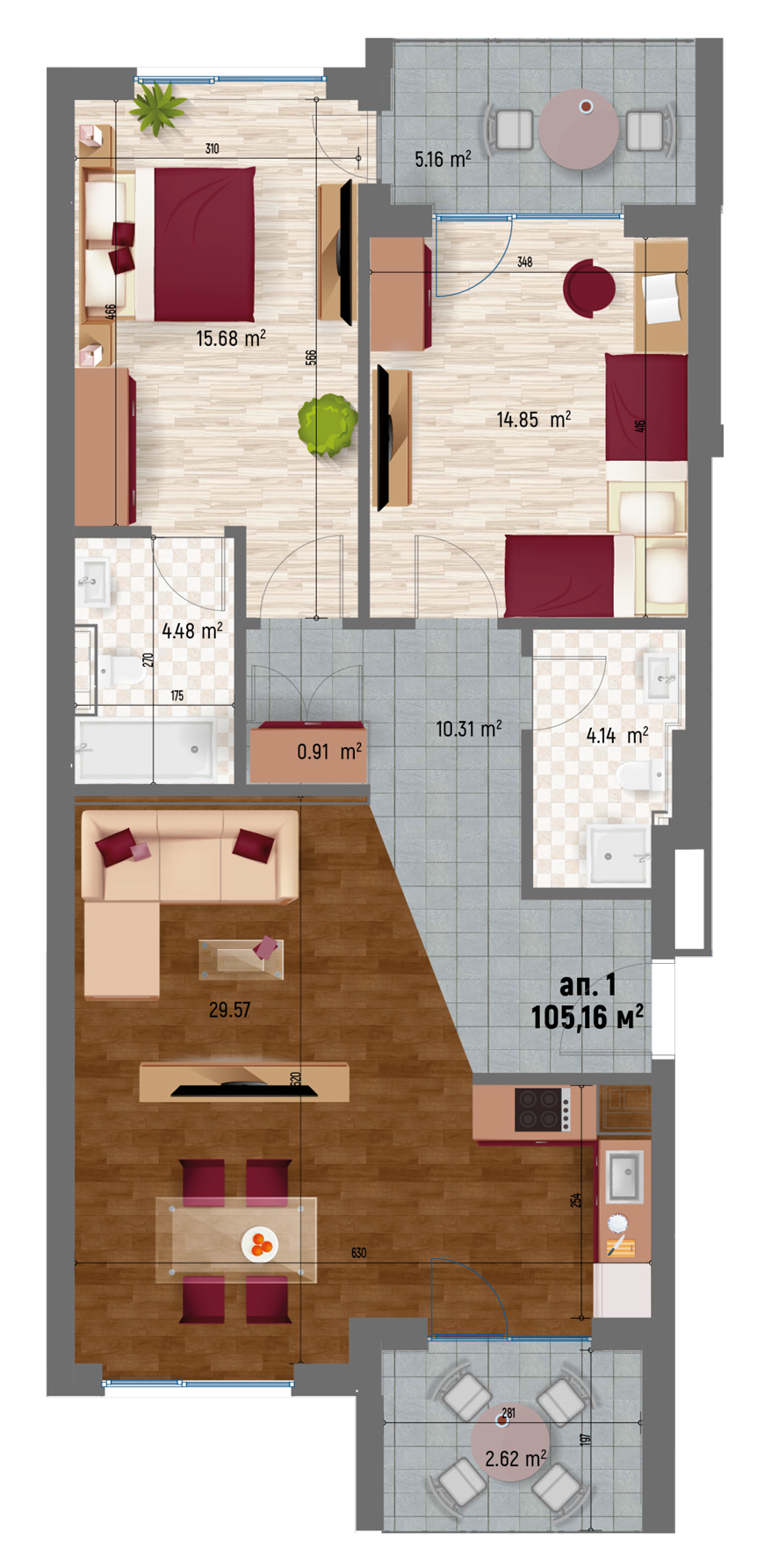 63 апартамента, от които: