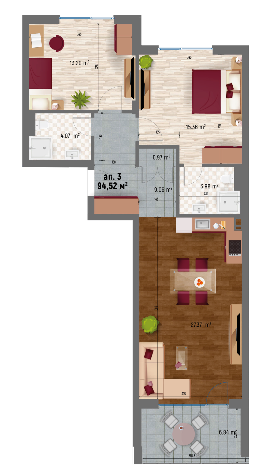 | Апартамент 3 | Юг - Север | тристаен | 20.08 | 94,52 | 17,4 | 15,55% | 111,92 | - | ПРОДАДЕН |