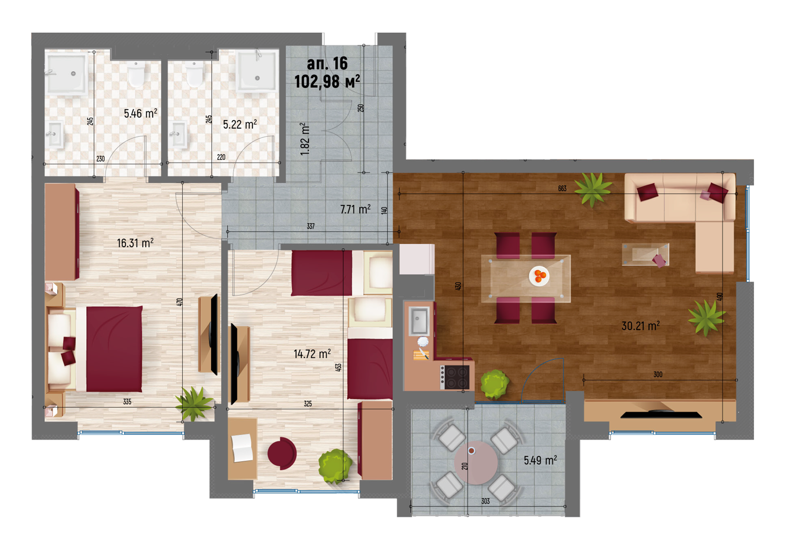 | Апартамент 16 | Юг | тристаен | 22,31 | 102,98 | 19,34 | 15,81% | 122,32 | - | ПРОДАДЕН |