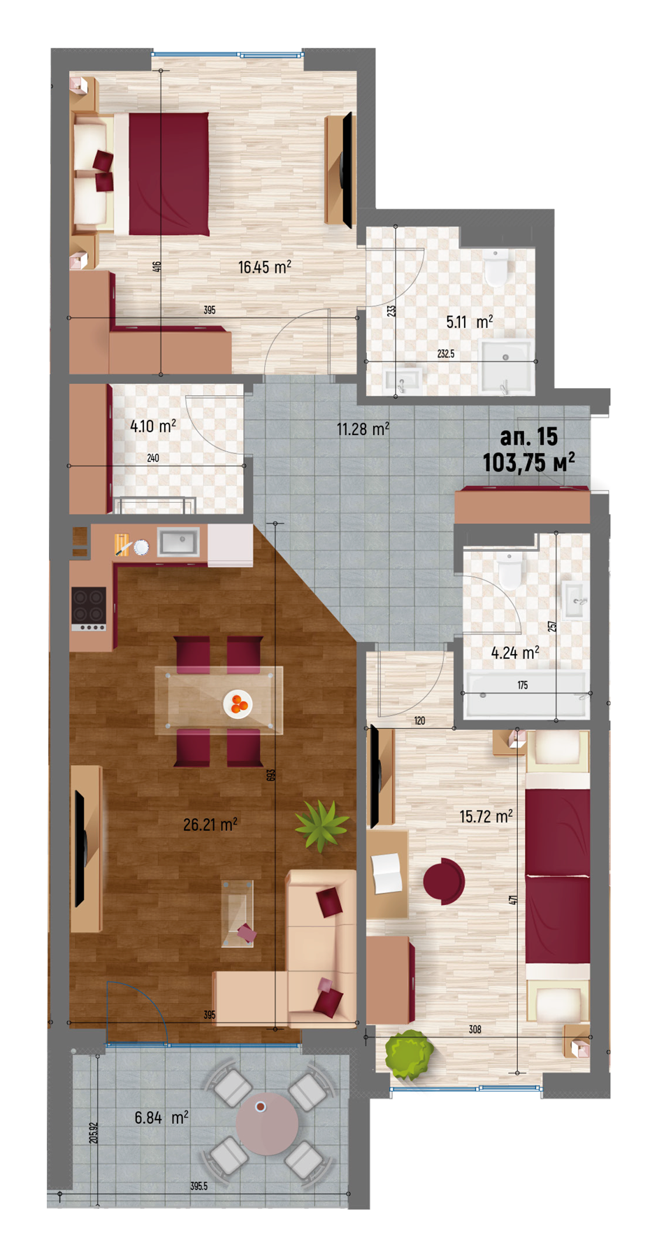 | Апартамент 15 | Юг - Север | тристаен | 22,49 | 103,75 | 19,49 | 15,81% | 123,24 | - | ПРОДАДЕН |
