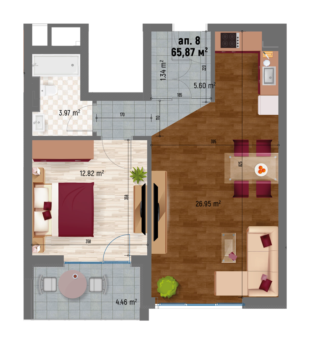 | Обект | Изложение | Тип | Земя | Чиста площ | Общи части | % Общи части | ОБЩО КВ.М | Прилежаща тераса | Статус |