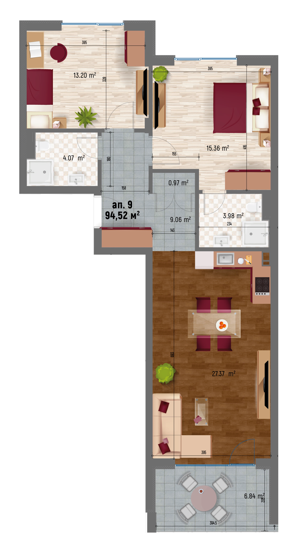| Апартамент 9 | Юг - Север | тристаен | 20.48 | 94,52 | 17,75 | 15,81% | 112,27 | - | ПРОДАДЕН |