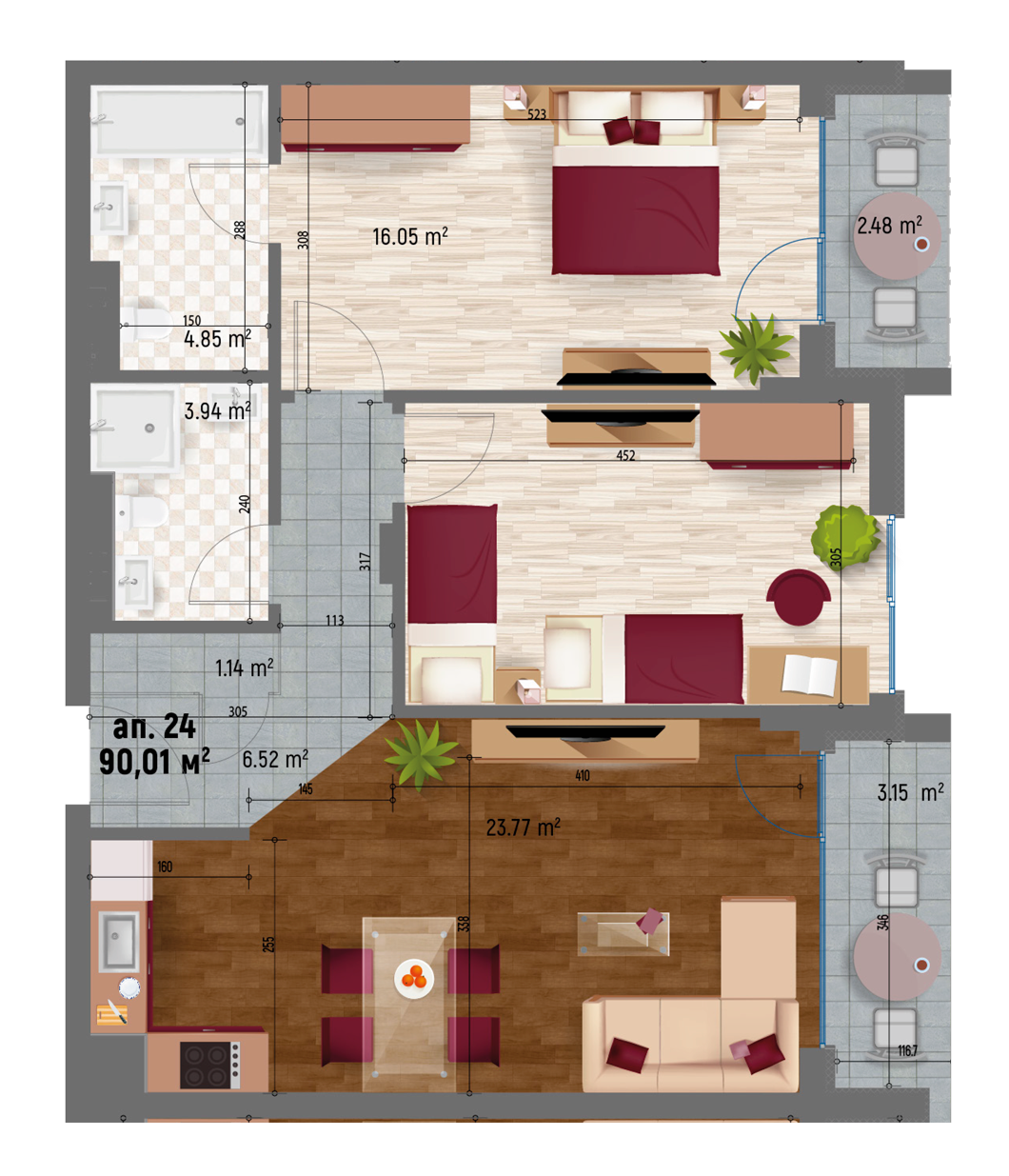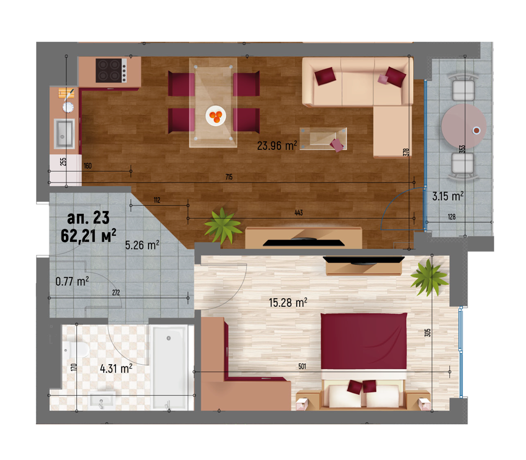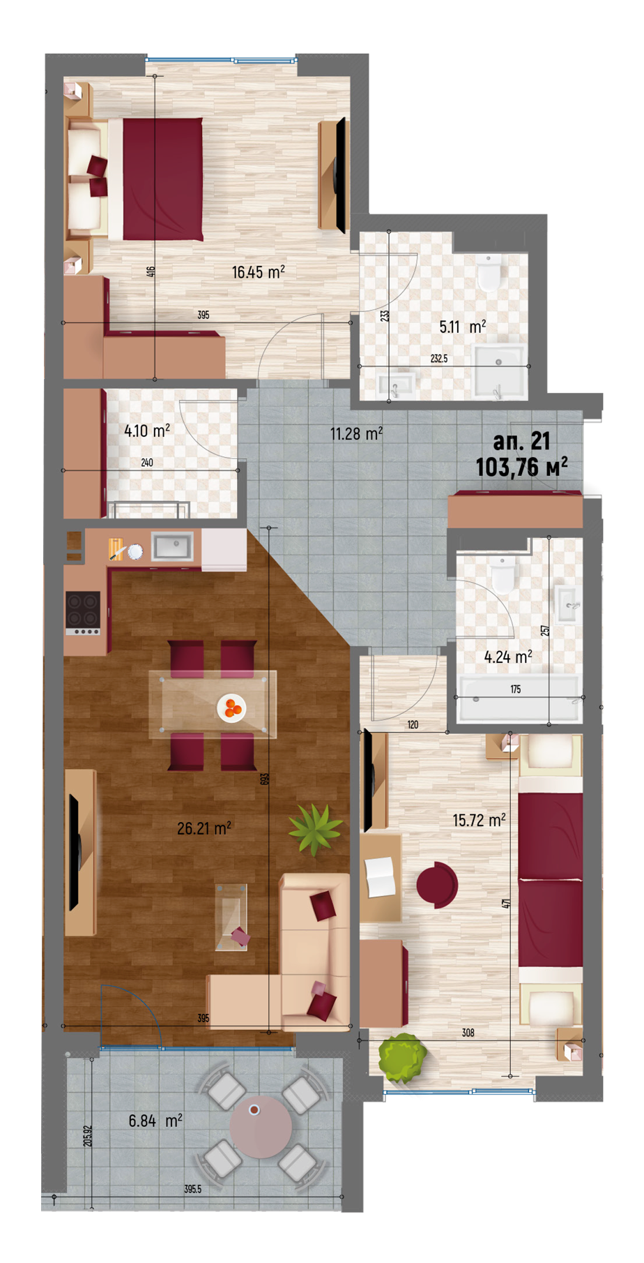 Апартамент 21 Юг - Север тристаен 22,49 103,76 19,49 15,81% 123,24 - ПРОДАДЕН