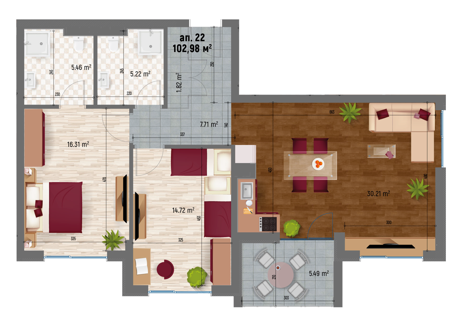 Апартамент 22 Юг тристаен 22,31 102,98 19,34 15,81% 122,32 - ПРОДАДЕН